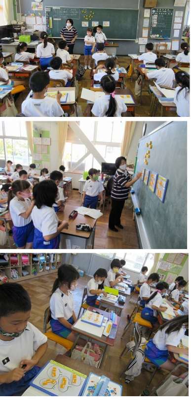 かけ算になる場面について考え、黒板の前に出て説明しました。