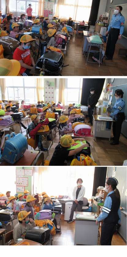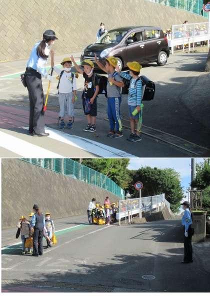 教室でルールについて学んだあと、下校に合わせて横断歩道の渡り方や道の歩き方を指導してもらいました。