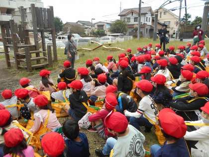 団地の公園に到着して、先生の話を聞きました。