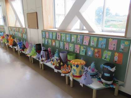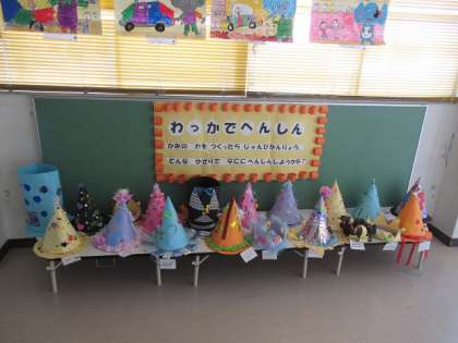 図工で作ったすてきな帽子ができあがりました。