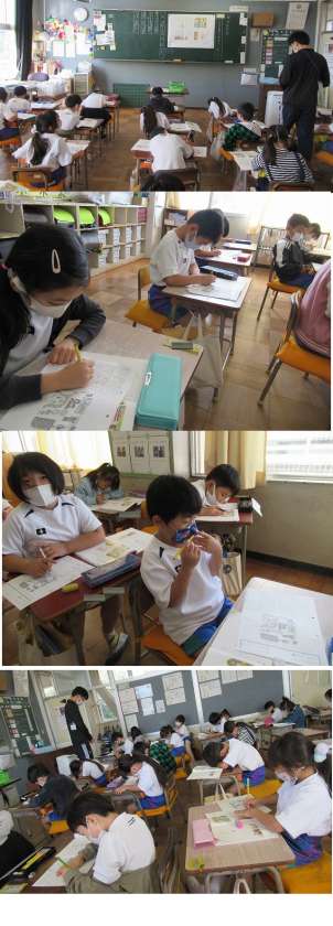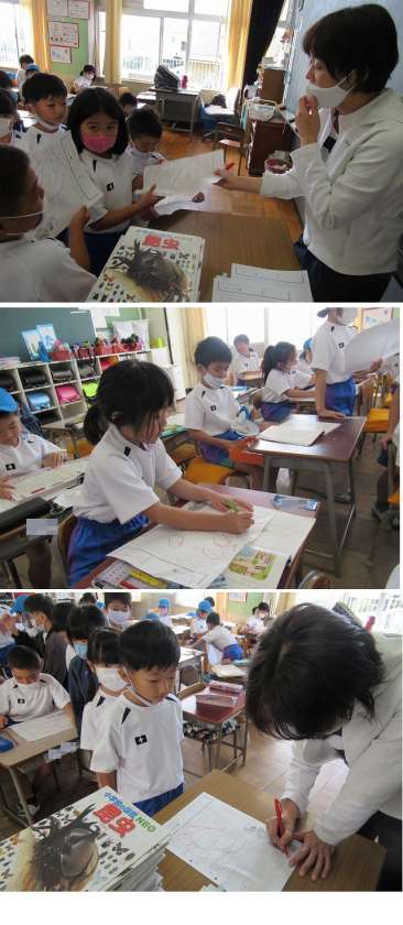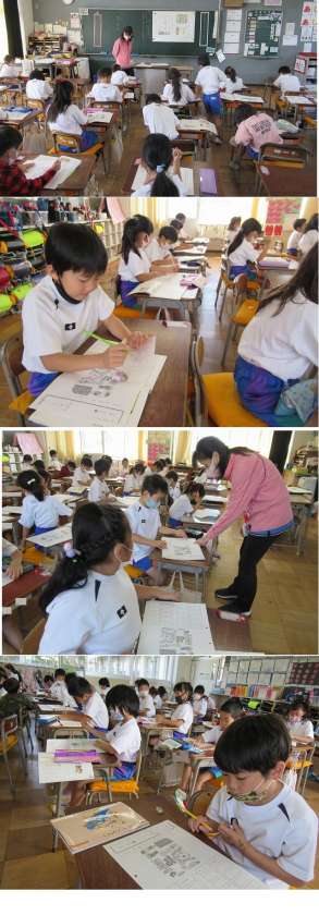 絵の中から、「なにが」「どうした」を探して、プリントに書きました。