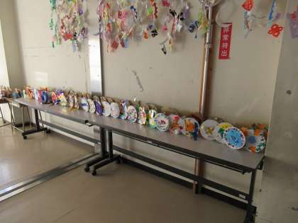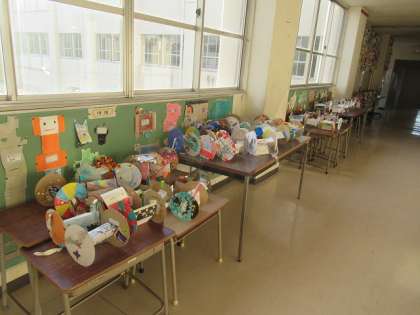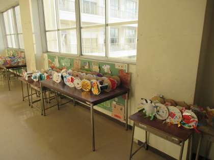 紙皿で作ったコロコロ転がるおもちゃができあがり、二階中央廊下に展示されました。