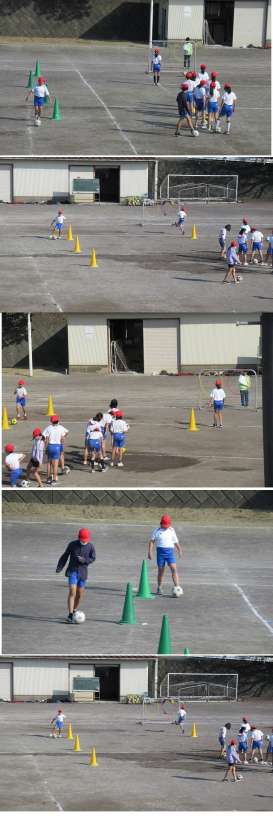 サッカー型のゲームに繋がるドリブルやシュートの練習に取り組みました。