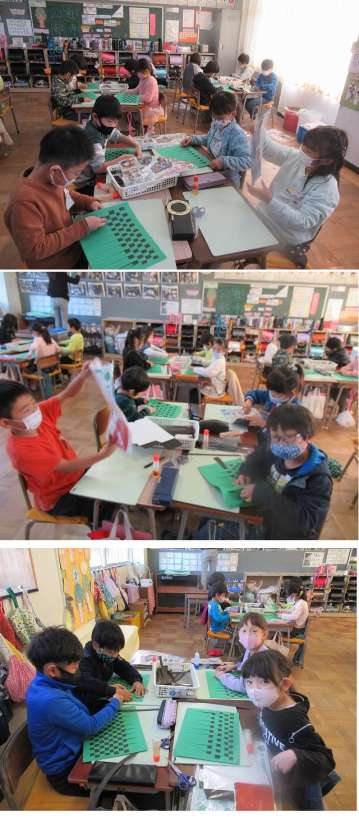 黒い紙に切れ目を入れたあと、細長く切った緑色の紙をはさんでいくと、見たことのある模様ができました。