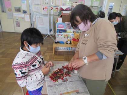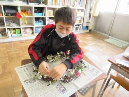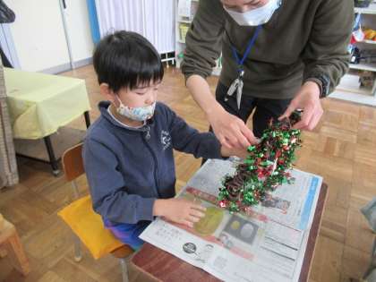 枠に飾りを付けてクリスマスリースに仕上げていきます。