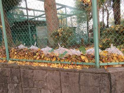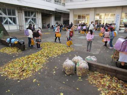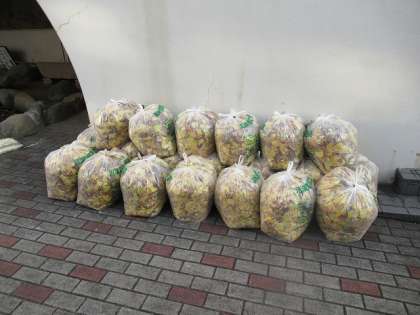 用務員さんが、落ち葉を集めて袋にまとめました。