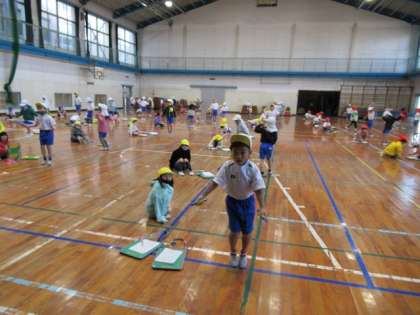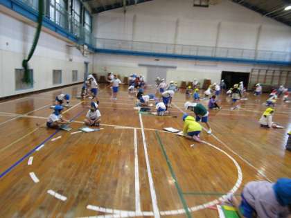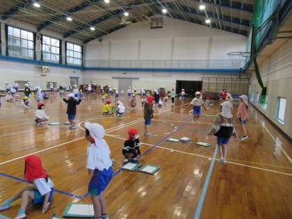 学年体育で、体育館で縄跳び運動に取り組みました。