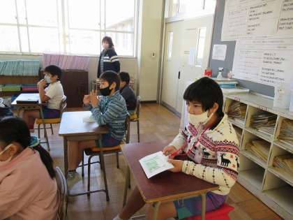 福笑いゲームを通して、英語で上下左右の言い方を学びました。