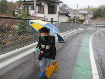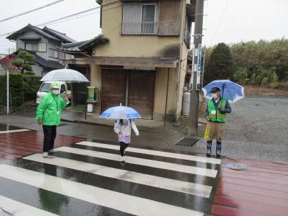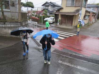 雨の中、傘を差して子供たちが元気に登校してきました。