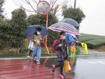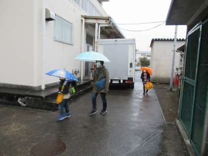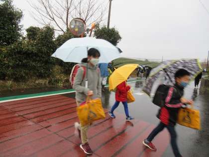 雨の中、傘をさして子供たちが元気に登校してきました。