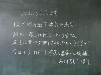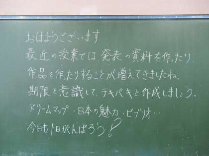6年生教室の黒板には、子供たちへのメッセージが書かれていました。
