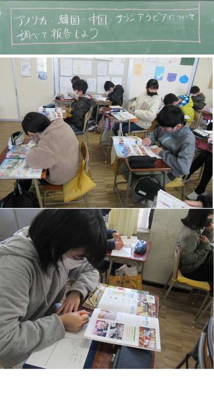 社会科で、アメリカ、韓国など4つの国について、教科書や資料集を使って調べました。