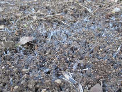 今朝の冷え込みで、ニュートンのリンゴの木の周りの土に霜柱が立っていました。