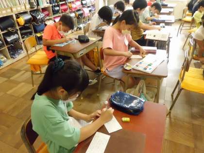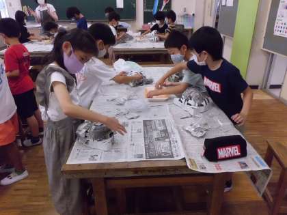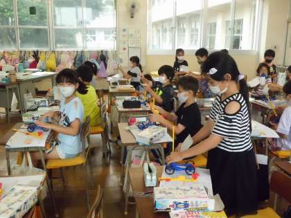上:理科で、13mを越えるように風を受けて走る車を作っています。