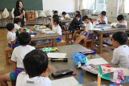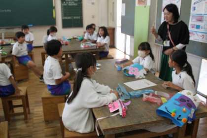 1組の図工の様子です。できあがった作品を紹介していました。先生のインタビューが楽しそうでした。