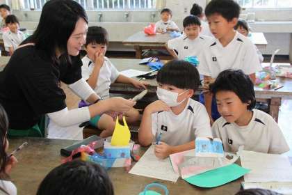 1組の図工の様子です。できあがった作品を紹介していました。先生のインタビューが楽しそうでした。