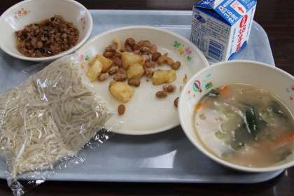 10月20日(金)の献立は、中華めん、担々麵(スープ・肉味噌)ポテトとナッツのから揚げ、牛乳でした。スープにめんと肉味噌を入れて、おいしくいただきました。