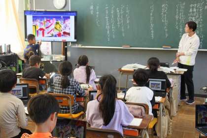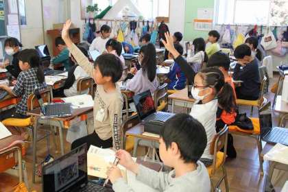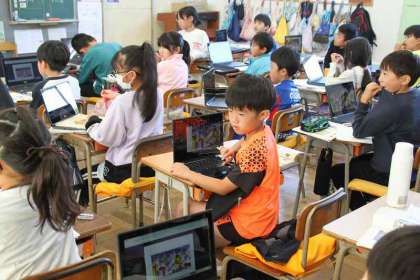 3組の国語の様子です。「ミニギャラリーの解説委員になろう」の単元、クロームブックを利用しながら、学習を進めていました。絵から読み取ったことを話すことがねらいです。