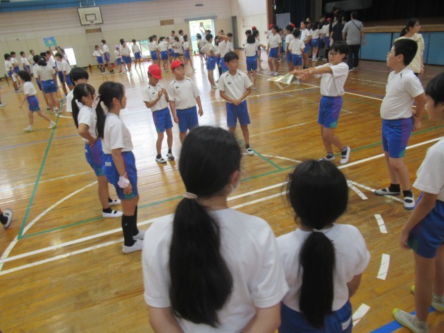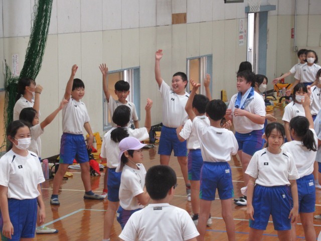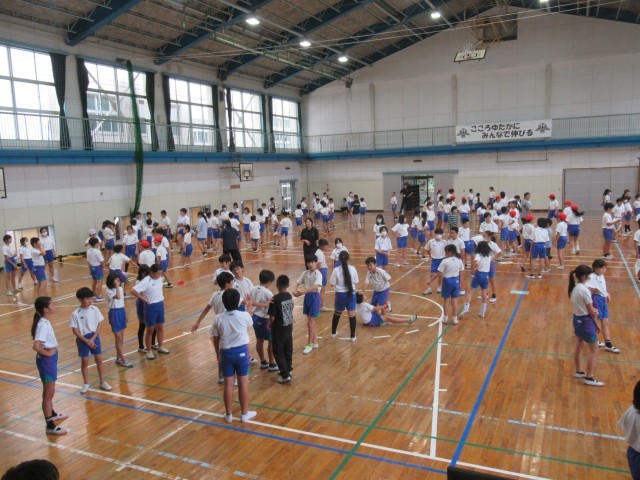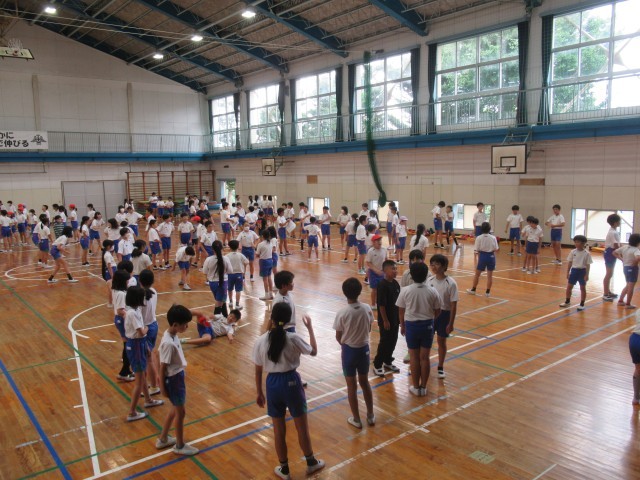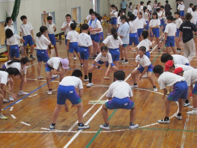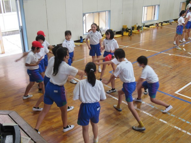 体育館で6年生が5年生にソーラン節を教えているところです。先輩の動きをしっかりと見て、運動会に向けて頑張ります!