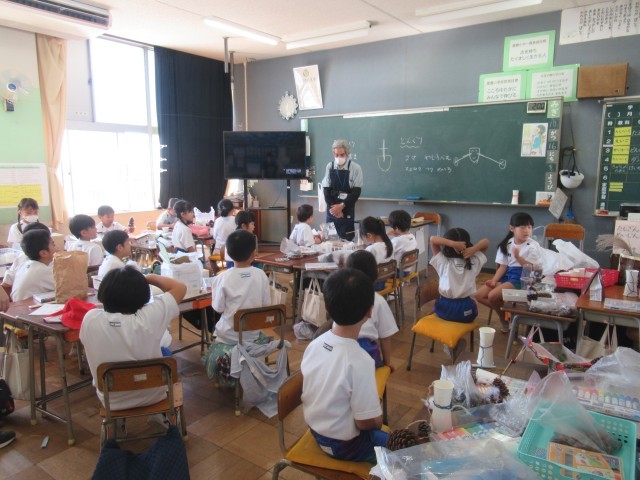 今日はゲストティーチャーを招いて、木の実を使ったおもちゃ作りを楽しみました。