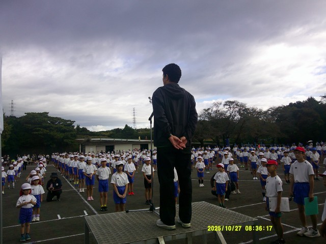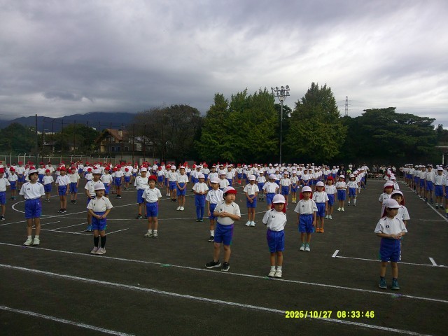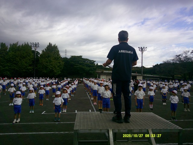 天候不順のため2日遅れの運動会が始まりました。開会式はみんな立派に参加できました。