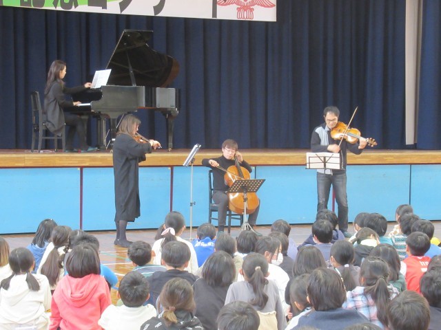 「三島せせらぎアンサンブル」の方々をお招きし、コンサートを開催しました。4・5・6年生と保護者、地域の方々も一緒に鑑賞しました。