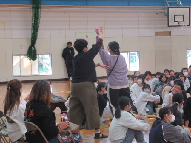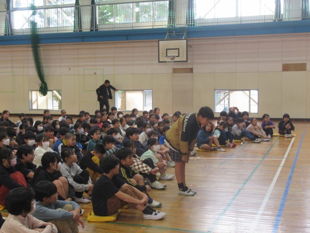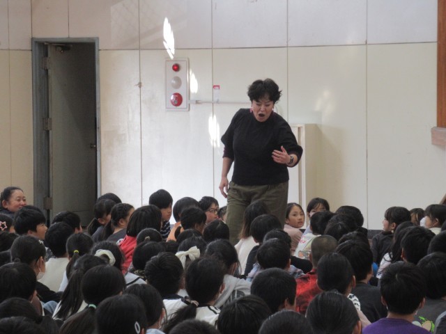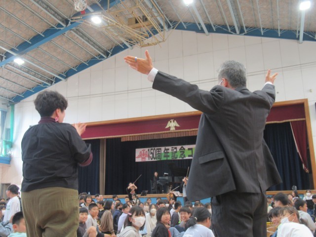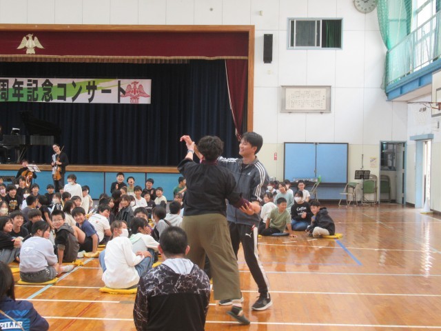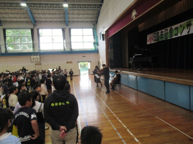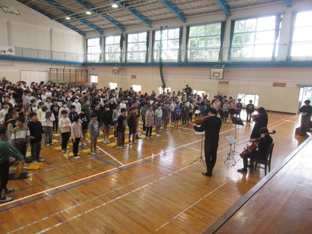 全国でも有数の音楽家の方々の演奏に、みんな聴き惚れてしまう素敵な時間となりました。楽器の紹介では、観客席に入って来てくださって、間近で音の出る様子を見せてくださいました。また、踊りを交えた楽しい歌などで盛り上がりました。最後には、「愛鷹小学校校歌」を演奏していただき、みんなで元気に歌って締めくくりました。