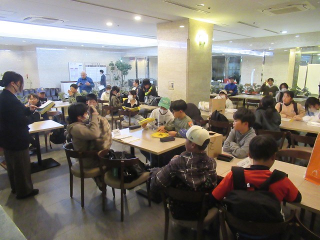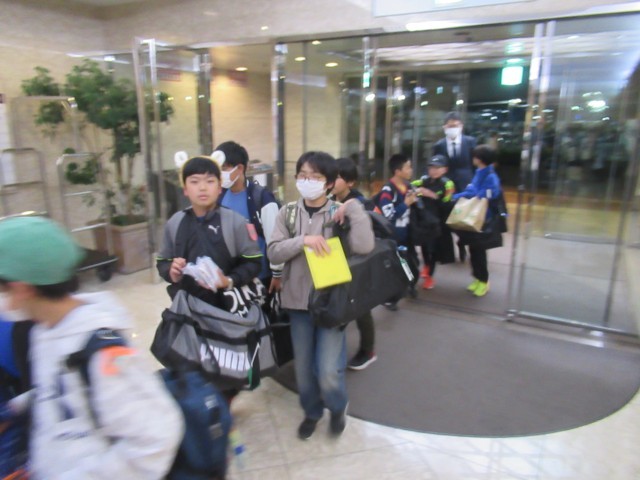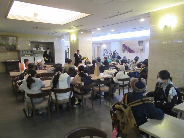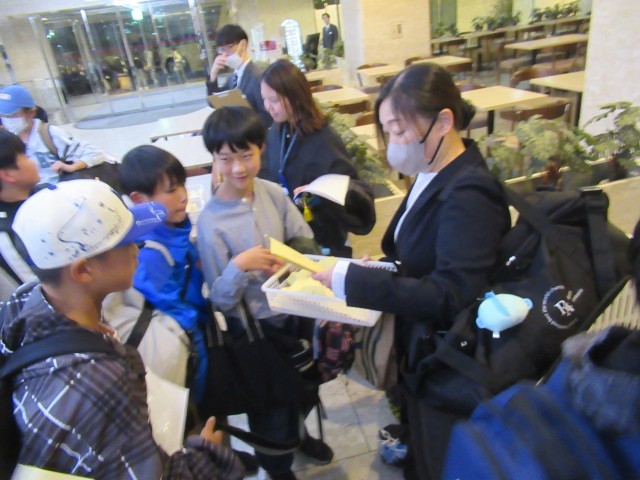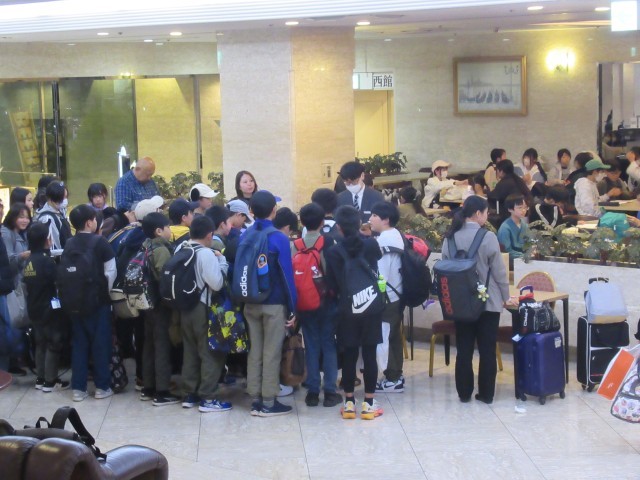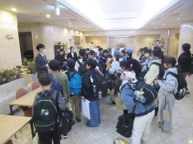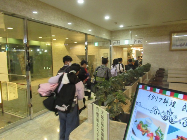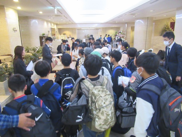 ホテルに到着。クラス毎にホテルの従業員さんから話を聞いて、鍵をもらって部屋に向かいました。その後、室長会議を行い、部屋での注意事項の確認をしました。