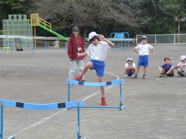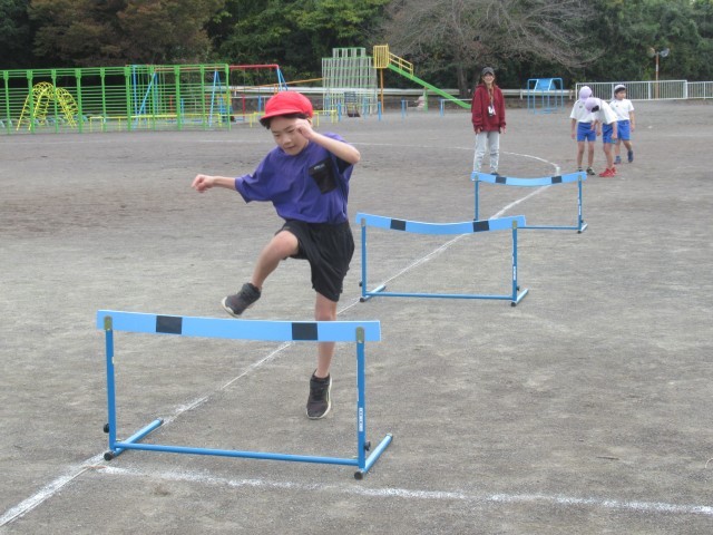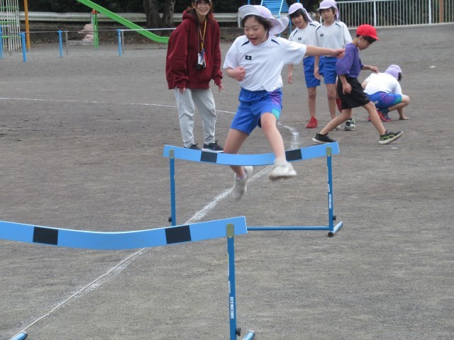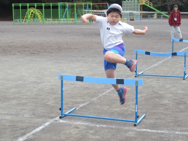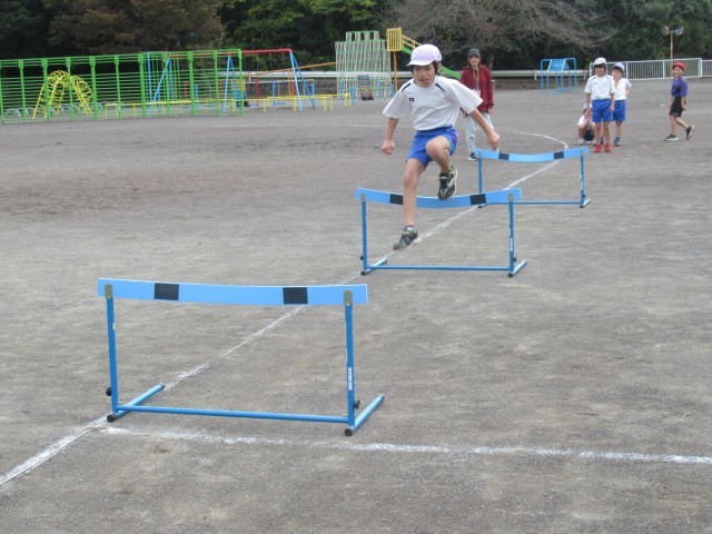 障害走の練習をしています。ウレタンでできたハードルなので、思い切って挑戦することができました。