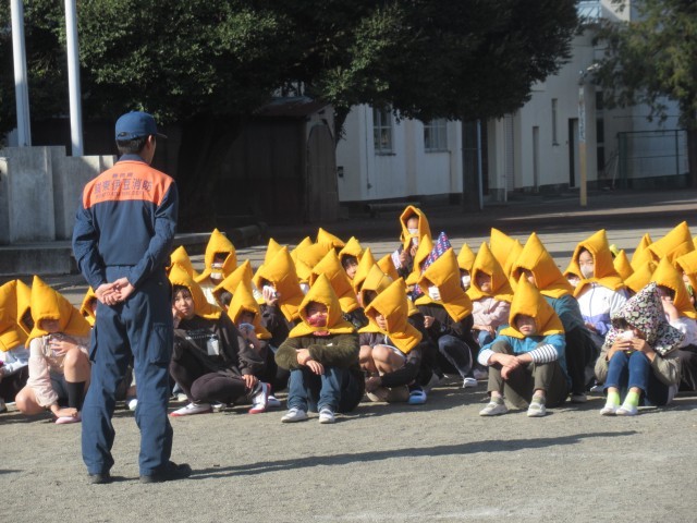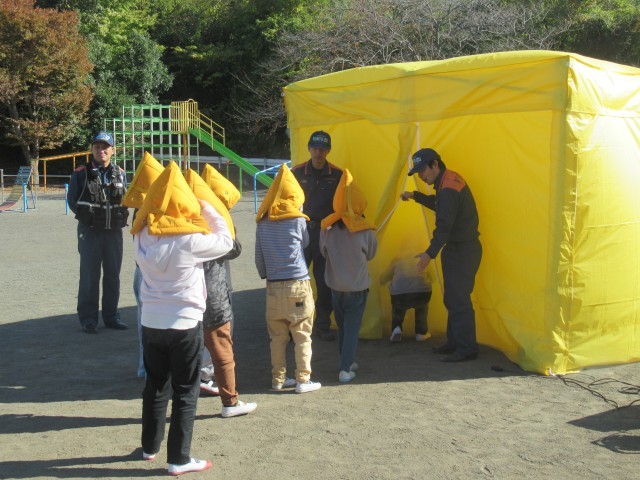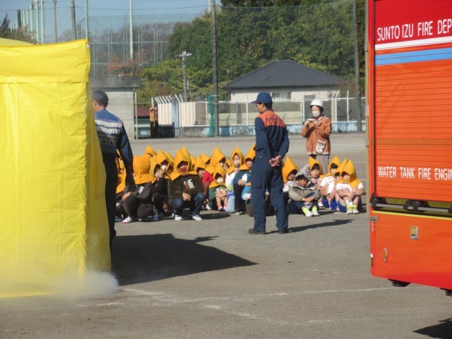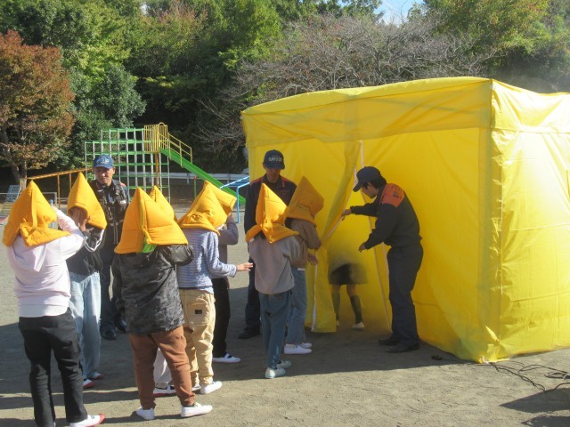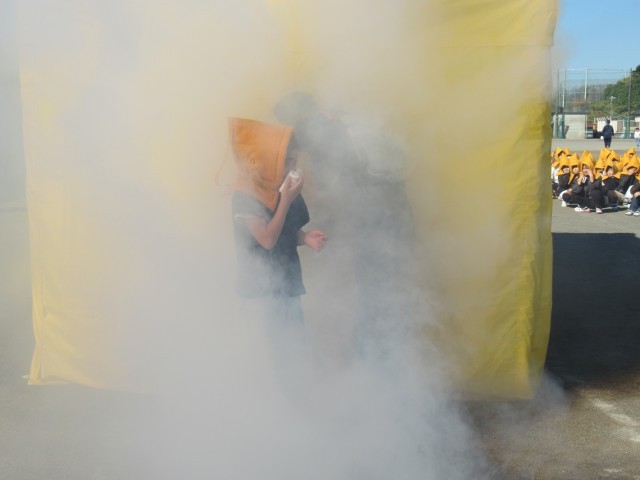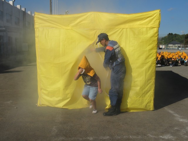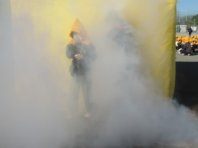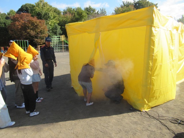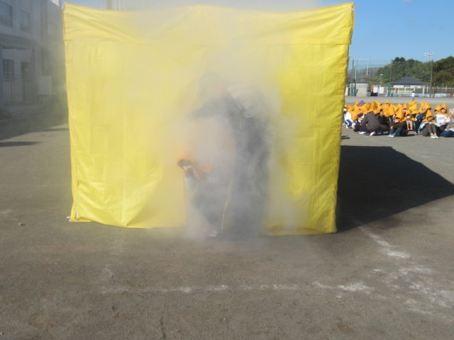 全体の訓練の後は、4年生が煙体験をさせていただきました。みんな、真っ白で何も見えないと驚いていました。できるだけしゃがんで歩くことや、壁伝いに歩けば、いつか出口にたどり着くと、教えていただきました。