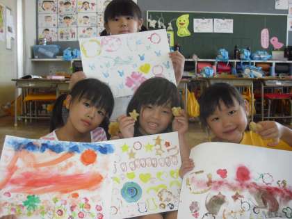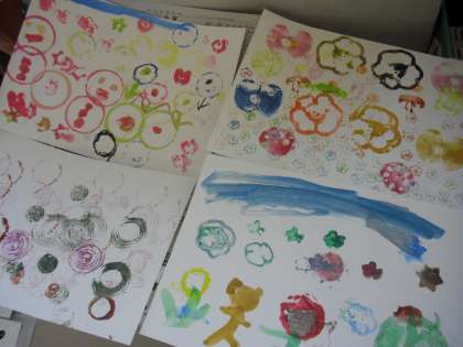 輪切りの野菜やデザートのカップで型押しをしました。車やお花畑、星空などいろいろな絵ができあがりました。