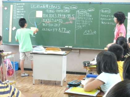 円の面積の公式を使って、いろいろな形の面積を求める学習をしました。みんな真剣に取り組み、考えました。