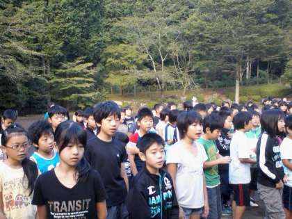 多くの子が眠そうな顔をしています。最後の朝の集いが始まりました。