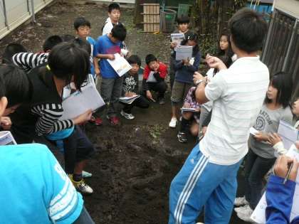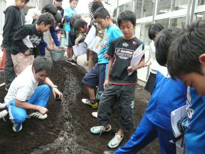 理科「流れる水のはたらき」の授業です。上流から水の量を変えて流すとどのような変化があるのか実験しました。「水の量が増えると川が広がった。」、「曲がったところは流れが速い。」など、様々な変化を見つけることができました。