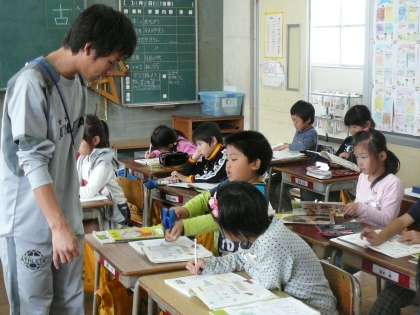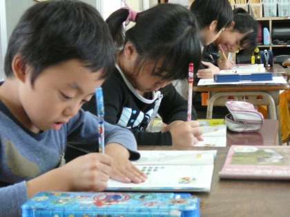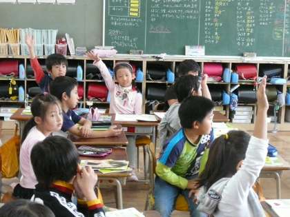 算数の時間です。九九の4の段を勉強をしています。黒板に描かれた絵から、式を立て、その意味を言葉で説明しています。多くの子どもが手を挙げて、積極的に参加しています。家でも、九九の勉強を一緒にやってあげてください。