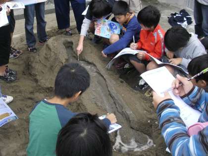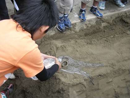 水が流れるときの様子を観察しました。土がけずられる様子,流れの速いところと遅いところの違い,水の量が多いときの様子などを見て,記録しました。本物の川でも同じことが起きているのかな。