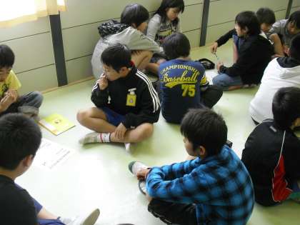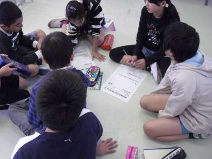 来週のペア活動に向けて,計画を立てました。どんな遊びをすれば3年生と一緒に楽しめるかな。雨が降ったら何をしようかな。班のメンバーとよく考えて計画を立てました。