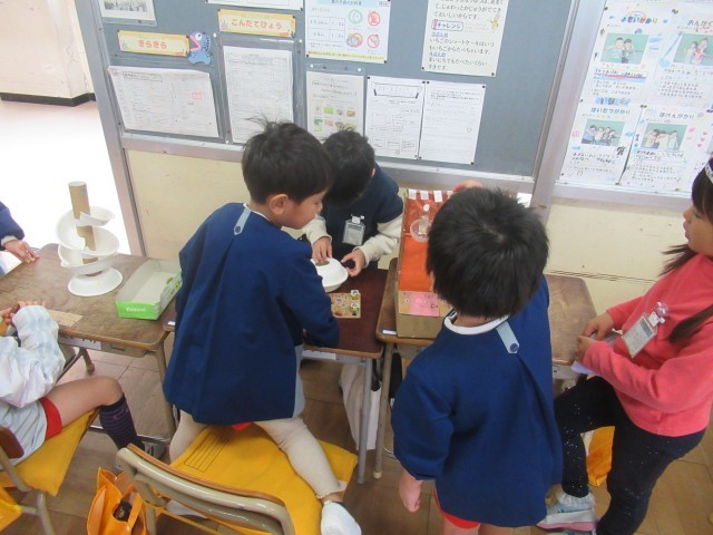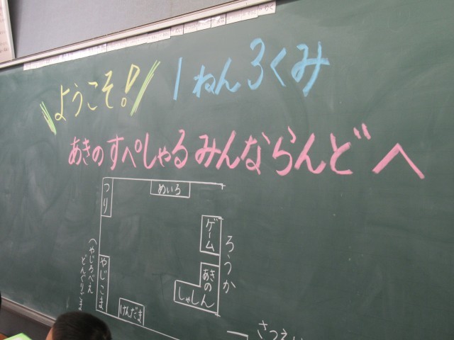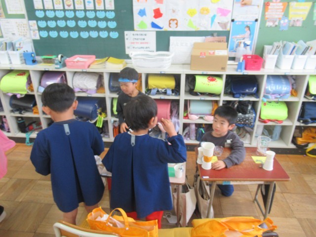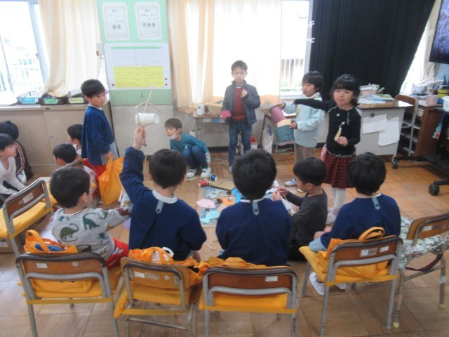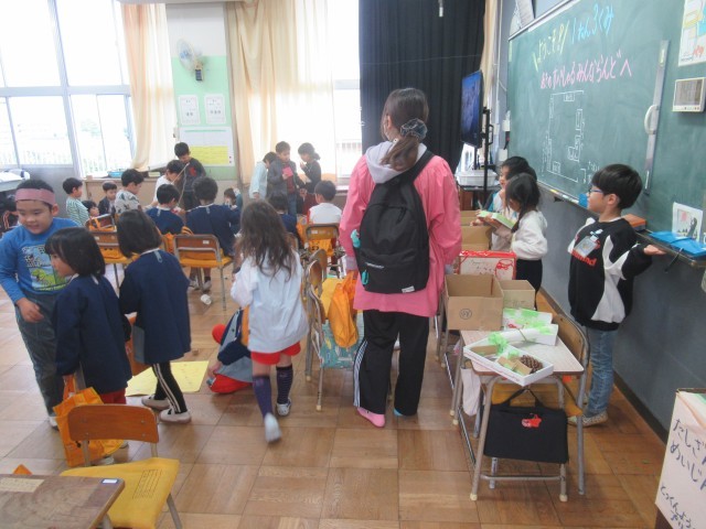 1年生が「秋を見つけよう」で作った色々なおもちゃを利用して、幼稚園や保育園の皆さんを招いてお祭りを開催しました。どうすれば楽しんでもらえるか、話合いを重ねてきたので、みんなとても喜んでくれました。お店屋さんの仕事も大きな声で立派にできました。