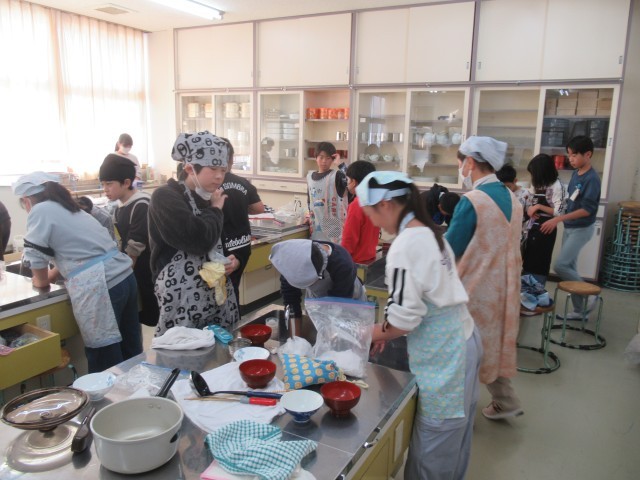 調理実習で、お米の炊き方を学習しました。用いたお米は、「わいわい塾」の皆さんと苗から育てたお米です。ここでも地域ボランティアの方々にお手伝いをお願いしました。栄養教諭も指導に参加し、お陰様でどの班も美味しいご飯ができました。ありがとうございました。