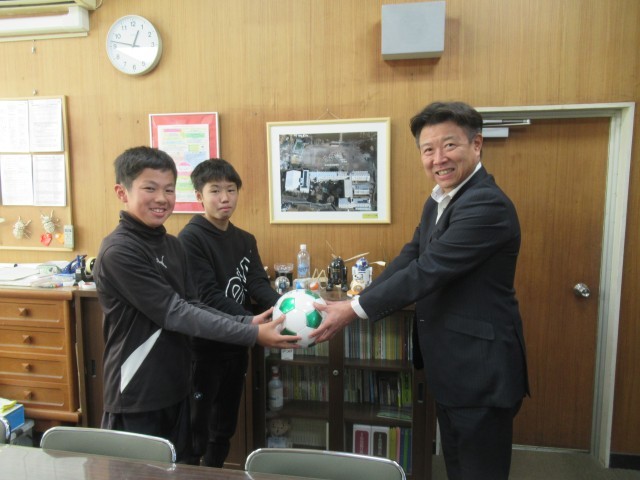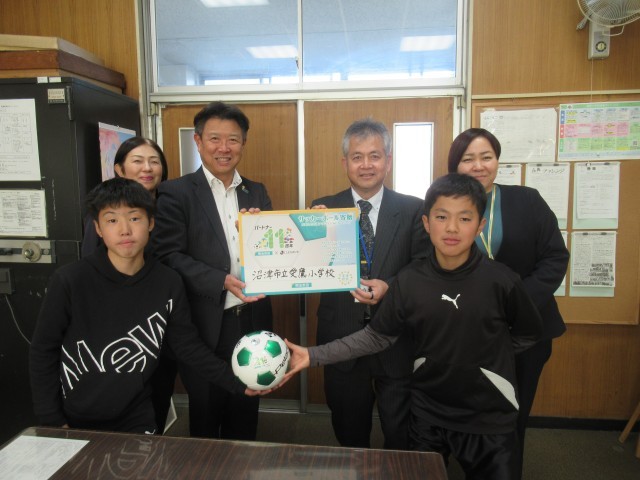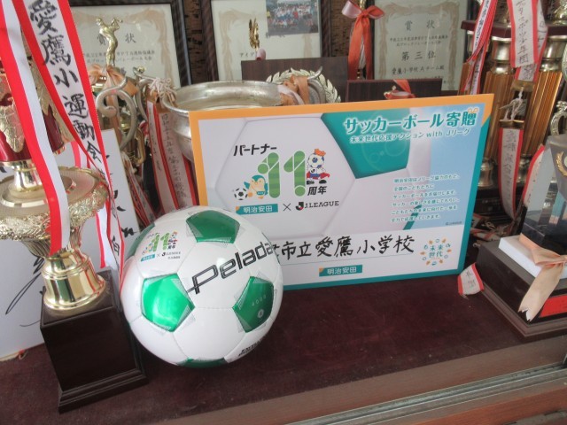 「未来世代応援アクション with Jリーグ」ということで、明治安田生命様より、代表の6年生がサッカーボールをいただきました。明治安田生命はJリーグのパートナーとして11周年を迎えられました。全国の子どもたちにサッカーボールを届け、サッカーの楽しさを感じてもらい、子どもたちの未来に向けた一歩を全力で応援してくださっています。少しの間、職員玄関に飾らせていただき、その後みんなで有効活用させていただきます。ありがとうございました。