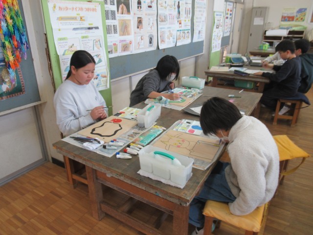 図工では、板を電動糸のこで裁断して、色を塗って、素敵なホワイトボードを作っていました。個性豊かなホワイトボードがたくさんできあがりそうです。けがに気をつけて頑張って!