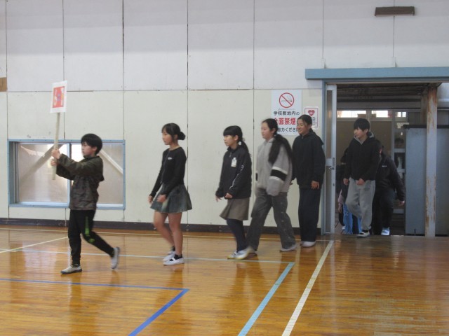 プラカードを持った5年生の先導で、6年生の入場です。お花のトンネルは、4年生の担当です。