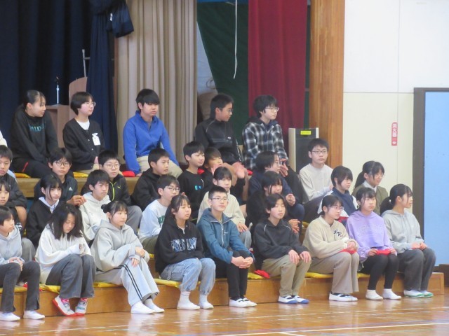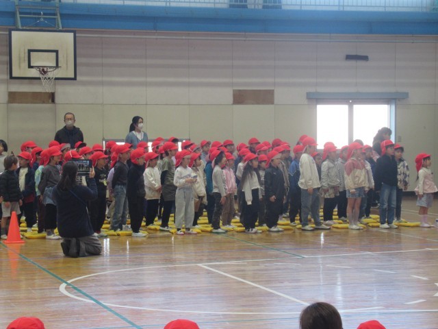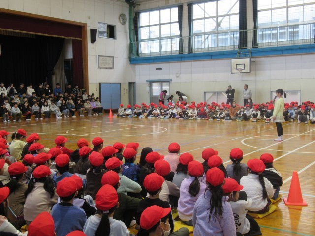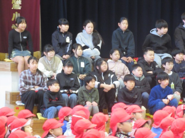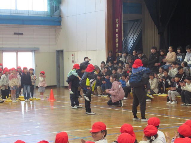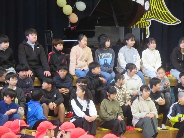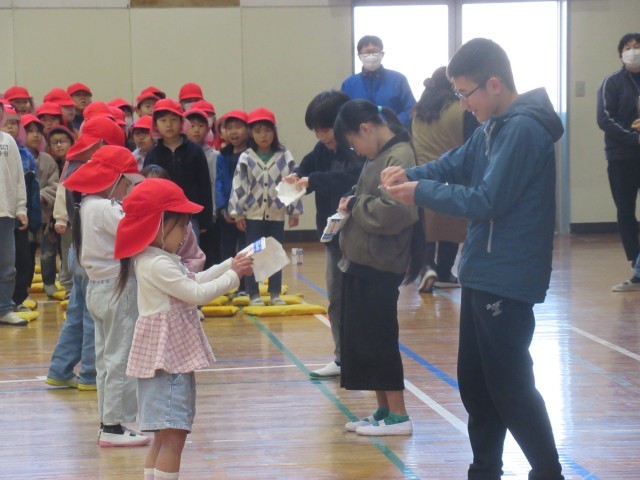 6年生が勢ぞろいしたところで、各学年からの感謝のプレゼントがありました。1年生は、もう一度おんぶをしてもらったり、教わった牛乳パックの開き方競争をしたりして楽しみました。