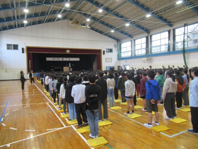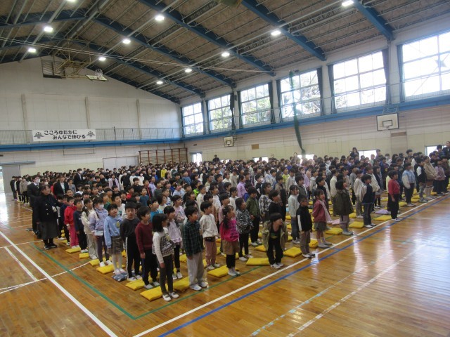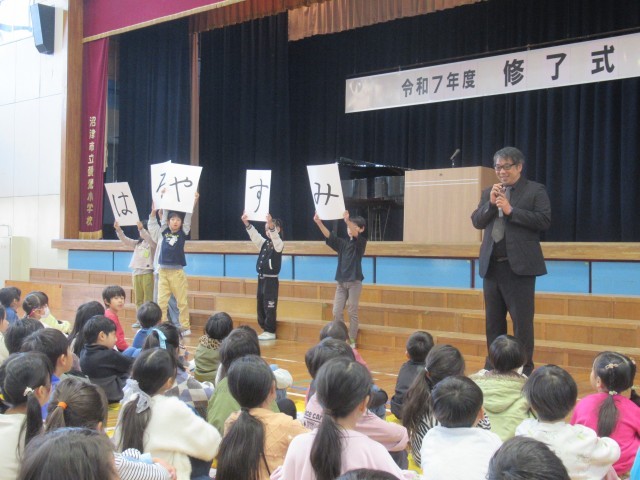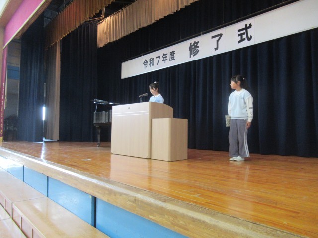 令和7年度の修了式が行われました。体育館に集まるのは、4月以来です。3・5年生の代表児童が1年間で頑張ったことの発表をしました。その後、各学年の代表児童が校長先生から、修了証書を頂きました。校長先生からは、それぞれの学年の全課程を修了したことを、お家の人に伝えるとともに、支えていただいたことへの感謝の言葉も伝えるようにとのお話がありました。校歌をうたった後に、春休みの過ごし方を確認して終わりました。