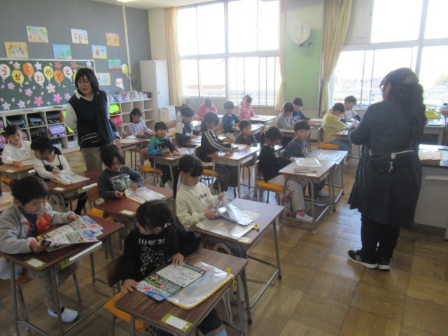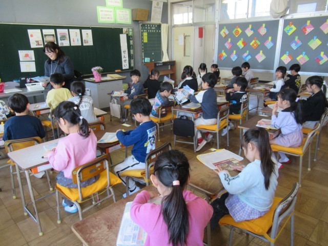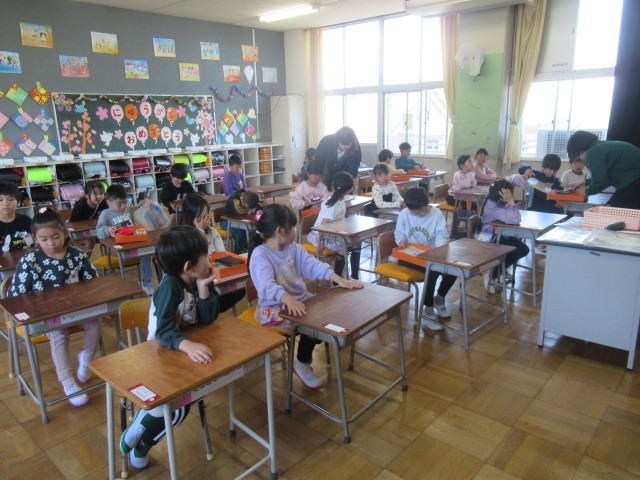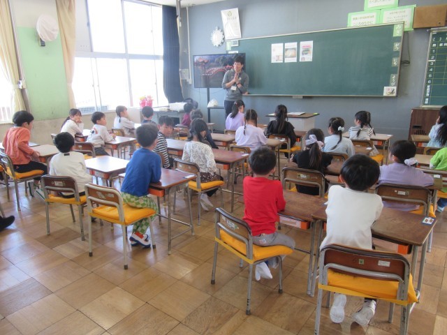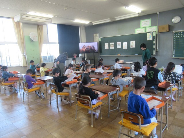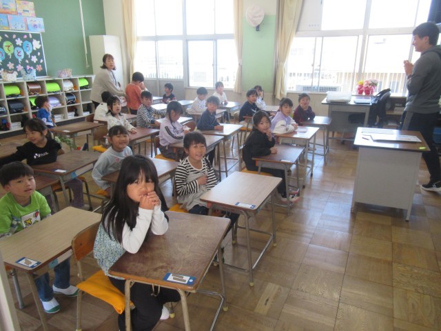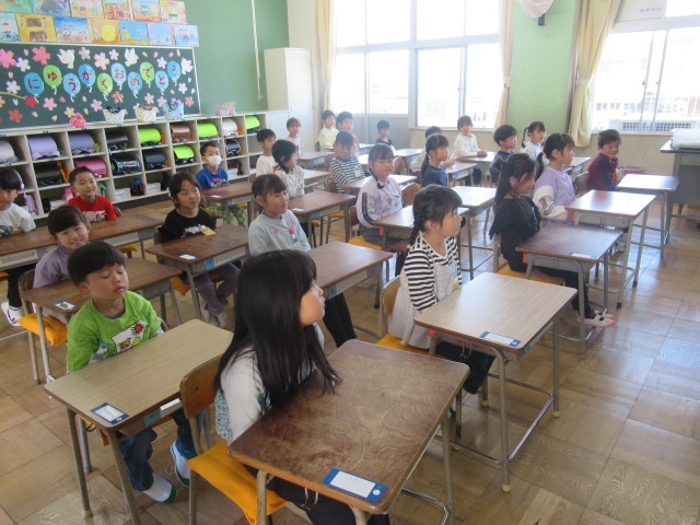 1年生はまだ小学校2日目です。とてもいい姿勢で先生のお話を聴くことができていて感心します。支援員さんも各クラス1人ずつ入って、お手伝いをしてくださっています。