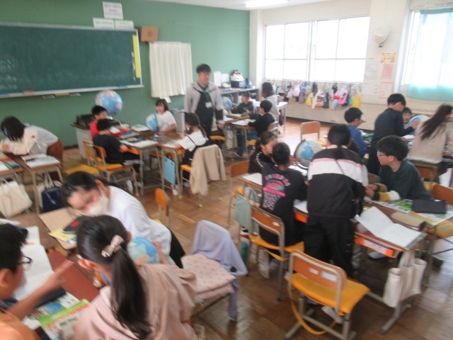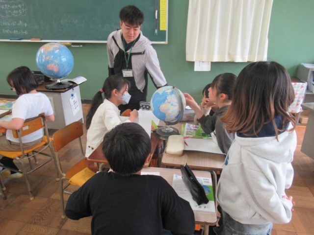 社会の勉強でした。世界の中で日本は大きい国なのか、小さい国なのか、地球儀を眺めながらグループで考えていました。