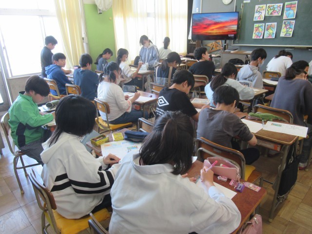自分の名前をモチーフにした、デザイン画を作製します。今日はネームペンで輪郭を整え、色を塗っていました。