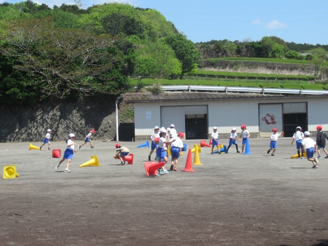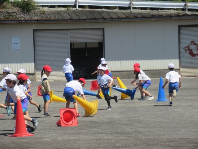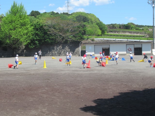 カラーコーンを使って、みんなで楽しく走り回っていました。天気が良いので気持ちよさそうに活動していました。