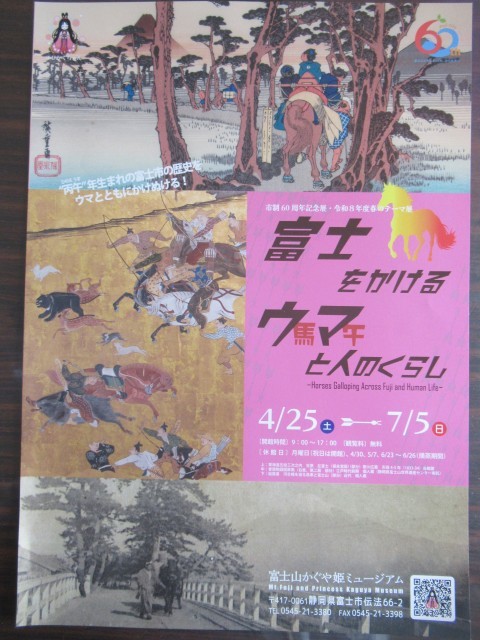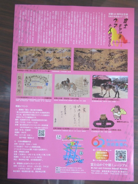 富士市の市制60周年を記念して、「富士をかけるウマと人のくらし」展が、4月25日(土)~7月5日(日)の期間で「富士山かぐや姫ミュージアム」開催されます。本校所蔵の「愛鷹三牧絵図」が、そこで展示されることとなりましたので、お知らせします。60周年目が午年ということもあり、馬と人の歴史をテーマにした展示だそうです。愛鷹地区はその昔は馬が沢山いた地域だったそうで、その頃の絵図は貴重なものだそうです。是非、足を運んでみてはいかがでしょうか?