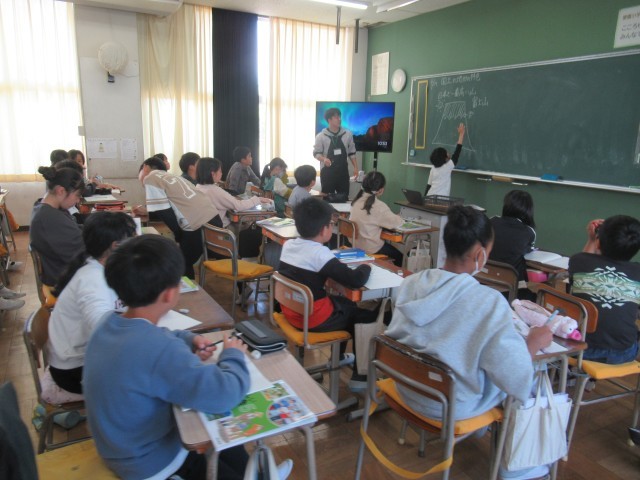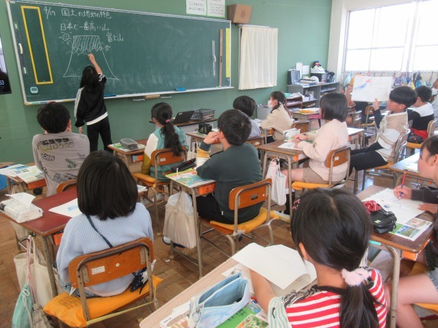 日本の国土の特色について学習していました。富士山に関連した場面でした。発表する人は、黒板に書かれた富士山を使って説明していました。